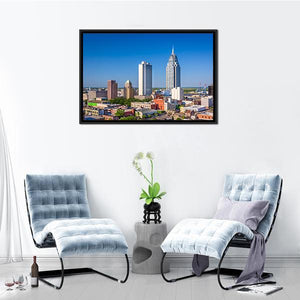 This canvas depicts an Alabama downtown cityscape from a high-angle view, with skyscrapers and a distinctive spire. Cool blue and white tones with brown and green accents create a bright, modern urban mood. Suited to contemporary living rooms or offices that favor clean, modern wall art.