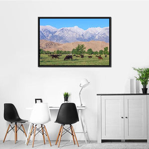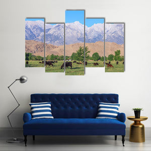This wide landscape features grazing cows set against a serene backdrop of snow-capped mountains, green pastures, and a blue sky. The peaceful scene and naturalistic style make it an inviting addition to any space.