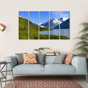 This canvas art features serene snow-capped mountains and a tranquil lake set against lush green hills. The majestic scene, highlighted by a clear blue sky and visible glacier, captures the beauty of nature in Alaska.