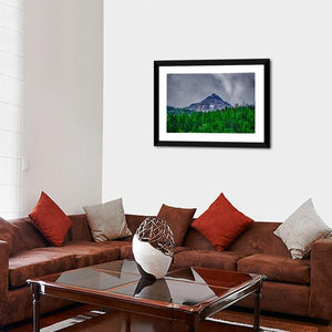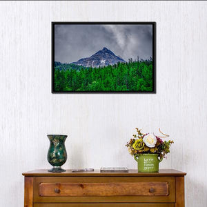 Alaska Rocky Mountains Canvas Wall Art shows a realistic mountain scene with snow patches, a dense evergreen forest, and a cloudy sky. The dramatic, moody composition uses green, blue, gray, and white tones to create strong depth and perspective, suited to modern homes and living spaces that favor natural, contemplative decor.
