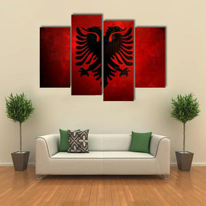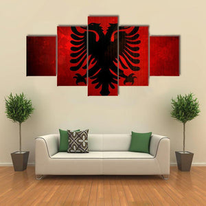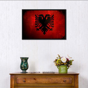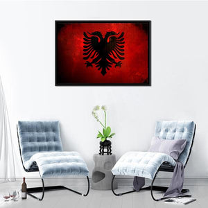 This canvas features a striking depiction of the Albania flag, showcasing a bold double-headed eagle against a dramatic red and black background. Its modern and graphic style makes it a captivating piece for any room.