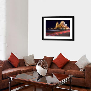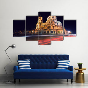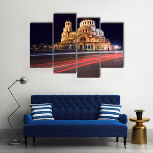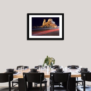 Experience the grandeur of the Alexander Nevski Cathedral with this photorealistic canvas wall art. The vibrant palette of gold, white, red, and black captures the illuminated cathedral against a dynamic backdrop of light trails on a cobblestone street.