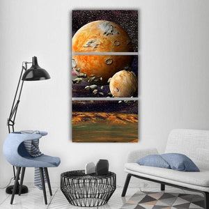 Planets and a sweeping asteroid belt take center stage in this canvas, set against a starlit, rocky alien landscape. Warm orange, brown and purple tones give the scene a cosmic, otherworldly, and vast mood. Works well in modern or sci‑fi‑inspired rooms and space-themed decor.