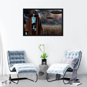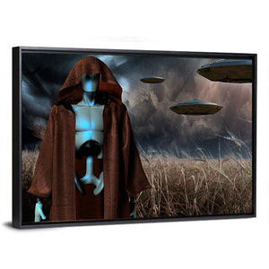A hooded, glowing blue alien-robot stands in a tall field beneath a stormy sky, with flying saucer-shaped UFOs hovering above. This sci-fi digital art piece centers the figure and uses brown, blue, gray, and white tones to build a mysterious, ominous, and eerie atmosphere. It works well in modern rooms or a sci-fi themed space.