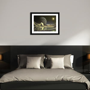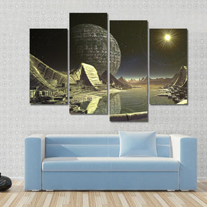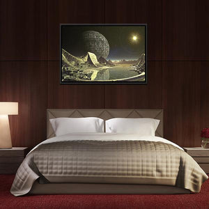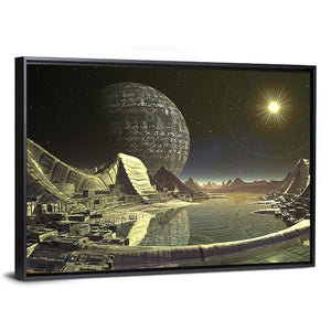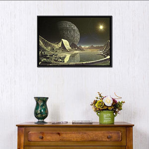 This captivating canvas artwork features a futuristic city set against an alien planet, with mountains and a vast ocean. The grand scene, rendered in dark blue and metallic tones, evokes a sense of mystery and awe.