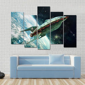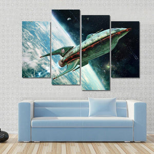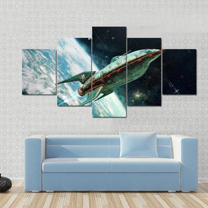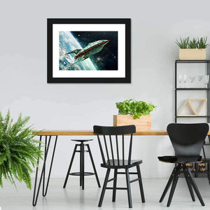 This landscape canvas art features a detailed retro-futuristic spaceship, set against a vibrant backdrop of Earth from orbit. With a palette of greens, blues, and blacks, it evokes an adventurous and expansive mood, perfect for anyone who loves space and sci-fi themes.