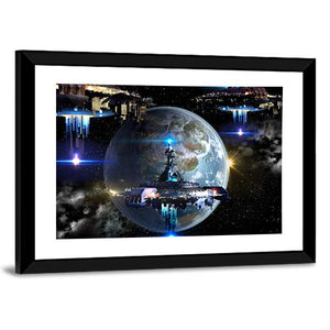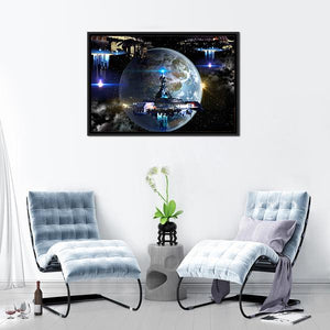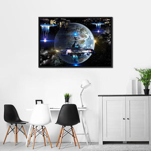 Experience the epic scene of an alien spaceship moving near an Earth-like planet. This awe-inspiring digital art piece features glowing blue lights and a detailed spaceship design, making it a striking addition to any modern decor.