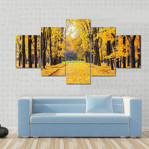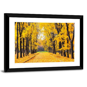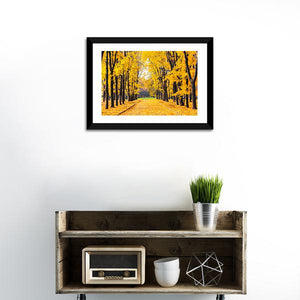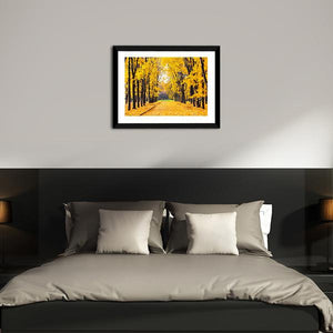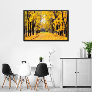 This beautiful canvas art captures a serene tree-lined path adorned with autumn leaves. The tranquil colors of yellow, brown, and green create a peaceful atmosphere, making it a perfect piece for nature lovers.