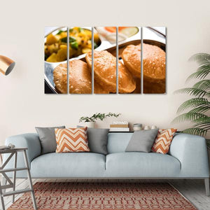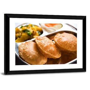 Celebrate the rich flavors of Indian cuisine with this vibrant canvas art featuring aloo sabzi and puri. This close-up depiction captures the appetizing warmth of fried bread, savory potato curry, and fresh vegetables, making it a delightful addition to any kitchen or dining area.