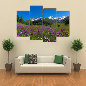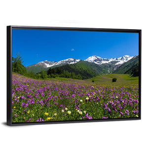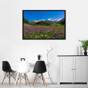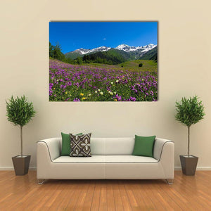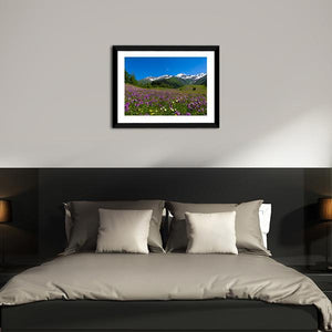 A serene, vibrant mountain meadow carpeted in dense purple and white wildflowers sits beneath jagged, snow-capped peaks and a clear blue sky. The realistic, wide-angle vista includes lush green, forested slopes that give the scene a majestic sense of scale. It suits modern or nature-inspired room decor where calm, natural landscapes are welcome.