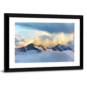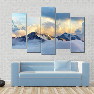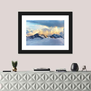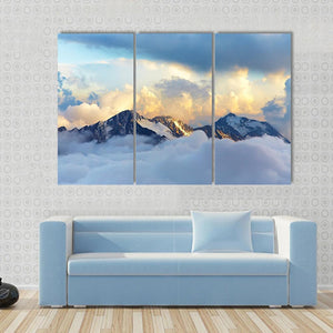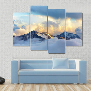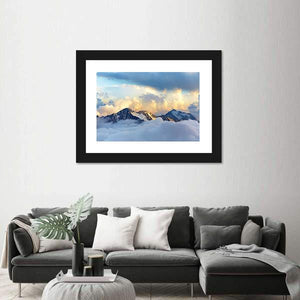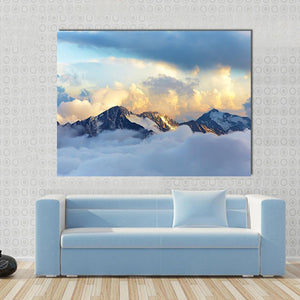 Experience the majesty of snow-capped mountains and dramatic clouds with this captivating canvas art. The serene palette of blue, white, and grey evokes a sense of awe, perfect for enhancing any landscape-themed decor.