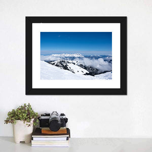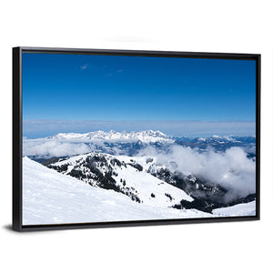 This landscape artwork captures the serene beauty of Austria's snow-covered mountains, framed by wispy clouds and tall pine trees. The crisp colors of blue, white, and green reflect a majestic winter atmosphere, making it a perfect addition to any nature lover's decor.