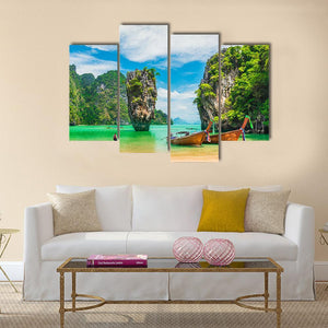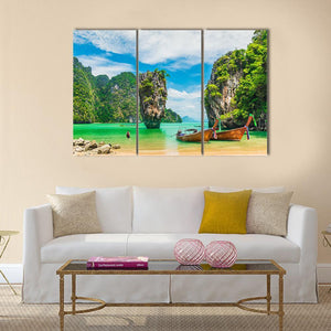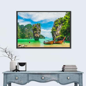 Phuket Island in Thailand is shown as a serene tropical beach with limestone karsts, lush vegetation, longtail boats and calm turquoise water. A lone person near a partially submerged rock gives the scene a quiet focal point; the green, blue, tan and white palette works well in coastal or modern interiors.