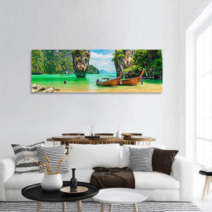 Phuket Island Panoramic Canvas Wall Art presents a tropical beach scene with blue and green sea, limestone karst formations, two longtail boats and a person wading in the water. The realistic panoramic composition follows the rule of thirds and feels serene yet vibrant. Suits coastal or modern interiors as a calm, natural focal point.