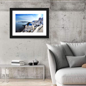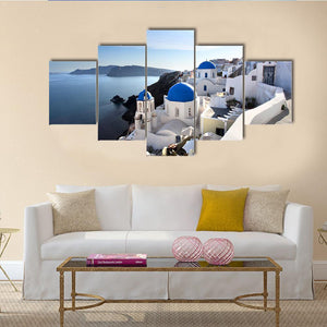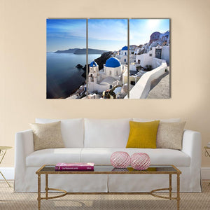 This serene canvas captures Santorini's iconic white buildings and blue domes against a picturesque backdrop of ocean and cliffs. Its bright colors and photorealistic style bring a touch of Greek charm to any space.
