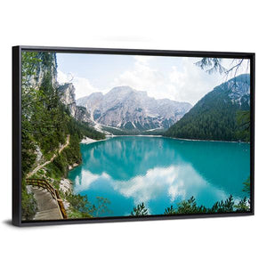Braies Lake Canvas Wall Art depicts a mountain lake with trees, a lakeshore path and a wooden railing, shown in natural blues, greens, grays, and whites. The wide-angle composition and calm reflections create a serene, majestic feeling that fits modern or nature-inspired room decor.