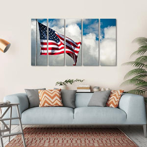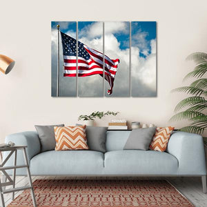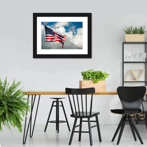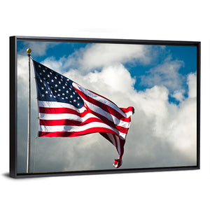 This vibrant canvas captures the American flag waving against a backdrop of fluffy clouds. Its patriotic theme and dynamic colors of red, white, and blue create a bright ambiance, making it an engaging focal point for any space.
