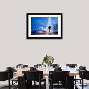 Honor the spirit of the American soldier with this striking canvas featuring the silhouette of a soldier against the backdrop of the American flag. The use of bold colors like blue, red, and white captures a patriotic and hopeful atmosphere, making it a perfect addition to any military-themed decor.