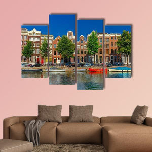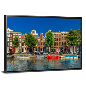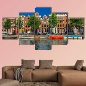 A realistic cityscape of Amsterdam canal houses and boats, seen at eye level with buildings receding into the distance. The blue, orange, brown and green palette creates a vibrant, sunny urban mood that works well with modern room decor.