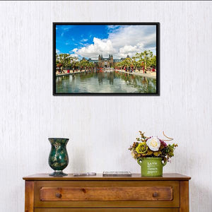 This canvas captures Amsterdam’s museum building with its reflection pond, surrounding trees and people on a bright summer day. Photorealistic detail and a calm, sunny palette of blues, greens, browns, whites and grays make it a peaceful choice for modern living rooms or an entryway.