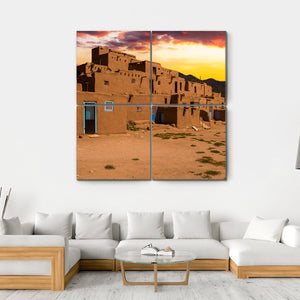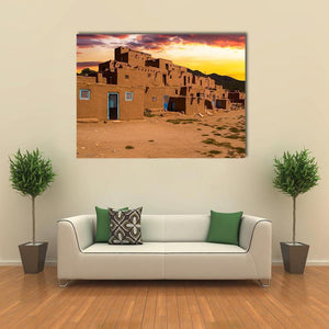 This photorealistic canvas captures the serene beauty of adobe buildings nestled against majestic mountains under a dramatic sunset sky. The warm palette of browns, oranges, and yellows evokes a sense of ancient tranquility, making it a stunning addition to your wall decor.