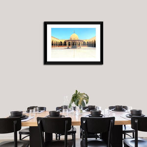 A panoramic view of an ancient mosque courtyard in Old Cairo, showing domes, a fountain with ornate detailing, and an arched colonnade. Realistic architectural tones of blue, tan, white and gold create a serene, historic, and grand mood that works well in living rooms or studies.