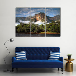 Angel Falls in Venezuela descends from a mountaintop through mist and lush rainforest in this photorealistic canvas wall art. The rule-of-thirds composition and layered depth create a majestic, serene atmosphere in greens, blues, browns and soft whites. It suits modern home decor as a calm nature focal point.