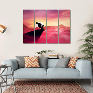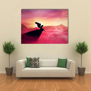 This stunning canvas features an angel silhouette sitting on a cliff, overlooking dramatic mountains and a vibrant sunset. The serene palette of pink, orange, and purple invites contemplation and adds a touch of fantasy to your wall art collection.