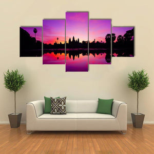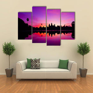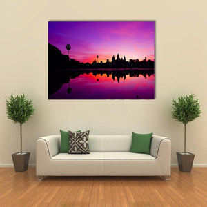Angkor Wat at sunset appears as a photographic canvas print, with silhouetted temple towers and palm trees mirrored on the water. A purple, pink and orange palette creates a serene yet vibrant and dramatic atmosphere. Works well in modern living rooms, bedrooms, or contemporary room decor.