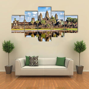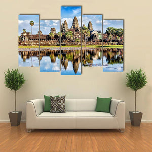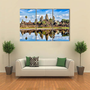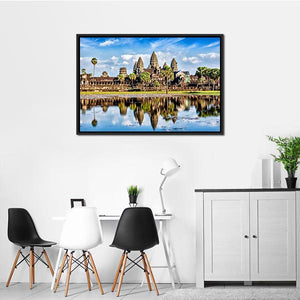 Angkor Wat Temple Canvas Wall Art shows the temple’s multiple towers and their calm reflection in water beneath a blue sky. The symmetrical composition and a blue, brown, green, and white palette create a serene, reflective mood that suits modern home decor.
