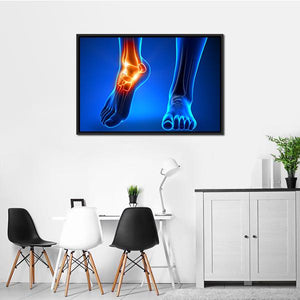 Ankle Pain Detail Canvas Wall Art shows a close-up anatomical profile of the foot and ankle rendered in a modern medical-illustration style. Cool blue tones set the bones against white while glowing orange and yellow highlights indicate inflammation on the left ankle and foot, giving the image a scientific, informative mood. It suits medical offices or a modern home study that needs clear, educational wall art.