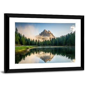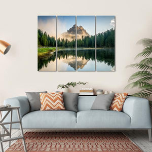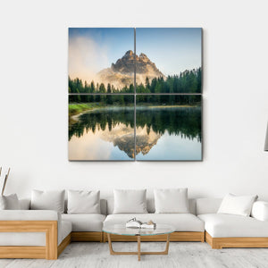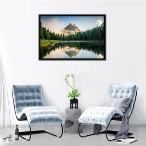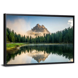 This captivating canvas art features Antorno Lake in Italy, surrounded by majestic mountains. The tranquil scene showcases jagged peaks, evergreen trees, and a serene lake that reflects the stunning landscape, all enveloped in swirling morning mist.