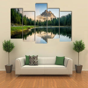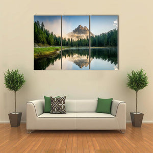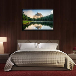 A nature-photography print of Antorno Lake with the Dolomites, showing misty mountain peaks, evergreen trees, and a calm reflected surface. The serene, majestic, and tranquil mood works well in modern living rooms, entryways, or nature-themed rooms.