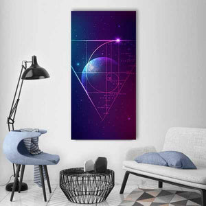 This striking artwork features a planet amidst a starry background, highlighted by a golden ratio spiral and geometric shapes. The cosmic palette of blues and purples evokes an ethereal, contemplative atmosphere, making it a fitting addition to modern décor.