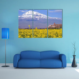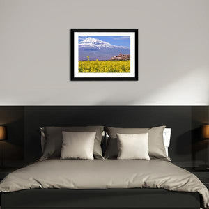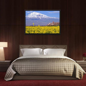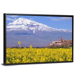 This canvas art captures the grandeur of Ararat, showcasing a snow-capped mountain, a vibrant field of yellow flowers, and a picturesque red-roofed monastery. The serene landscape invites calmness and beauty into your space.