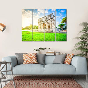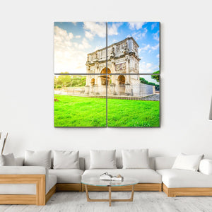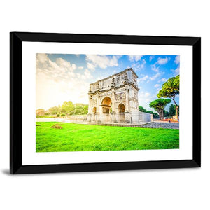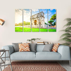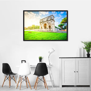 This canvas art captures the grandeur of the Arch of Constantine, a remarkable historical monument nestled in greenery. The scene, with its intricate carvings and fluffy clouds, evokes a bright and peaceful atmosphere, making it a delightful addition to any space.