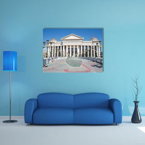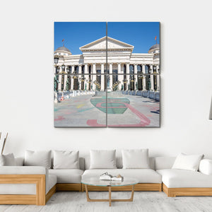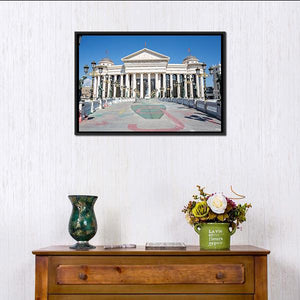 This canvas art showcases the grand Eye Bridge in Skopje, featuring elegant neoclassical buildings and statues against a striking sky. The thoughtful composition highlights a glass walkway, inviting a modern touch in any space.