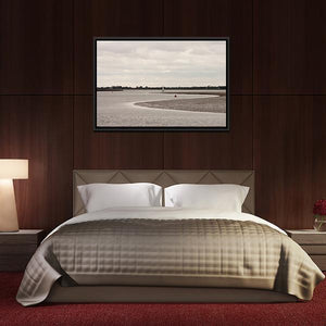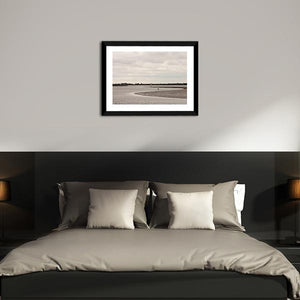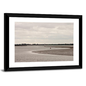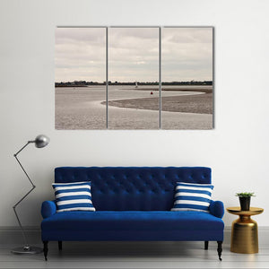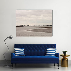 This canvas art captures a serene waterway scene featuring a river, a sailboat, and a quiet shoreline under a calm, overcast sky. Its modern style and muted palette of gray, brown, white, and blue create a peaceful atmosphere.