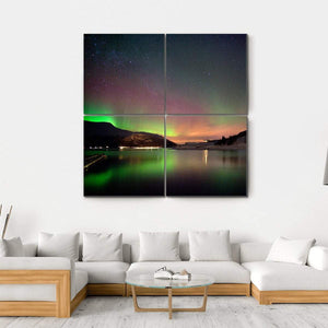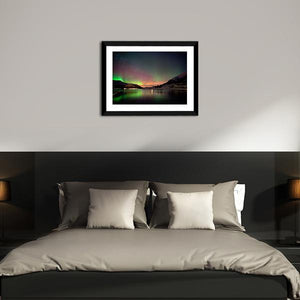 Experience the wonder of the Arctic night with this canvas art featuring the enchanting aurora borealis. Vivid greens and purples dance across the sky, reflecting on a calm lake surrounded by snow-covered mountains, creating a serene and awe-inspiring atmosphere.