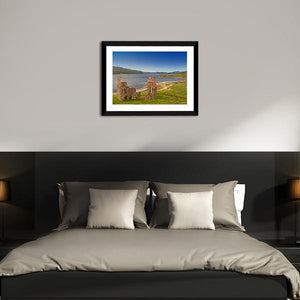 This canvas art captures the ancient ruins of Ardvreck Castle surrounded by serene hills and a tranquil lake. The realistic portrayal features stone ruins on a grassy shore, calm waters, and distant mountains beneath a clear blue sky, creating a historic atmosphere for your space.