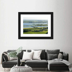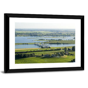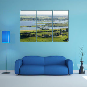 This canvas art captures the serene beauty of the River Rhine, featuring a bridge and waterway surrounded by green fields and trees. The peaceful scene, complete with boats on the water and livestock in the fields, adds a tranquil touch to any space.