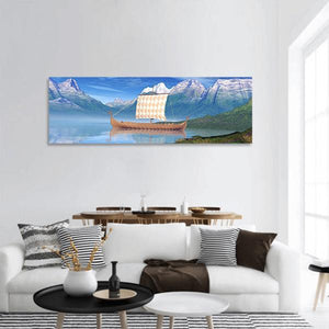 A realistic panoramic canvas showing a Viking ship on a calm lake with distant mountains, rendered in blues, greens, whites, browns, and tans. The scene feels serene, majestic, and quietly adventurous, and it fits well as modern room decor for living rooms or studies.