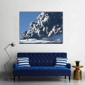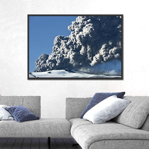 This dramatic landscape artwork captures the awe-inspiring eruption of the Eyjafjallajokull volcano, showcasing a billowing ash cloud above snowy mountains. Its powerful and destructive mood makes it a striking addition to any space.