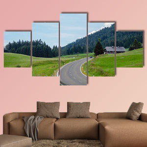 This canvas print shows a winding asphalt road beside a wooden house with forested mountains and grassy fields. The green, blue and gray palette and strong sense of depth give the scene a peaceful, scenic mood that suits rustic or nature-focused rooms.