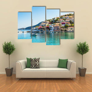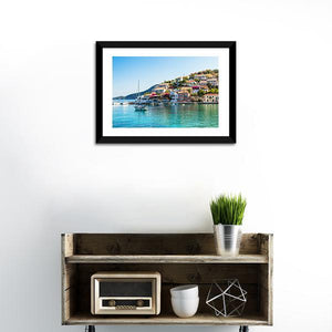 A realistic Greek Islands cityscape showing a sunlit coastal town with white multi-story buildings, trees, and sailboats on a blue sea. The composition uses depth and perspective with a blue, white, green and orange palette to create a serene, vibrant summer mood that suits modern or coastal-inspired rooms.