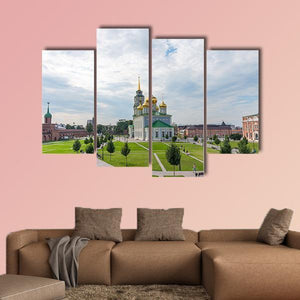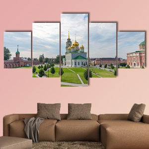 A photorealistic view of the Epiphany Cathedral, featuring a domed church with gold spires framed by a well-manicured lawn, paved pathways and scattered trees. The wide-angle composition and clear green, blue and white palette create a serene, bright summer mood that fits well in home interiors and modern spaces.