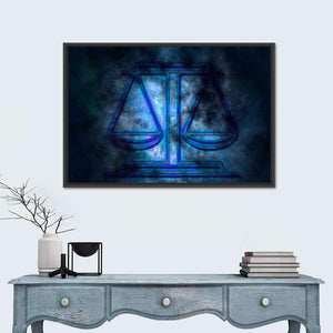 This canvas shows the Libra scales astrology symbol set against a starry, cosmic backdrop. Symmetrical, modern-abstract composition uses deep blue, black and purple with a glowing, neon-like outline to create a mysterious, balanced mood. Suited to modern rooms or astrology-themed decor as a focused wall piece.