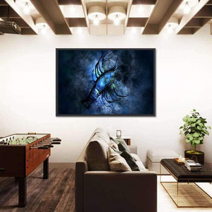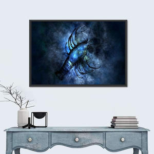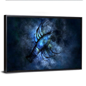 This Scorpio canvas shows a glowing blue crayfish alongside its constellation against a deep black-and-blue cosmic background. The abstract, modern composition uses symmetry and depth to create a mysterious, celestial mood that fits modern or astrology-themed rooms.