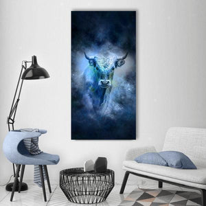 This canvas depicts a centered Taurus bull against a nebula-like, starry background with glowing blue and green accents. The abstract, modern composition feels powerful, majestic, and subtly ethereal, making it a good fit for modern or astrology-themed rooms.