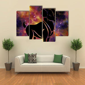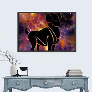 This canvas shows the ram zodiac sign centered against a cosmic background, with a silhouette of a ram and glowing stars and nebulae. The color palette of black, orange, purple, white and gold and a minimalist, abstract style create a mysterious, bold, celestial mood. Suits modern, minimalist rooms and contemporary wall decor.